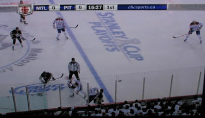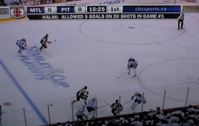 At this point the Habs were still in good defensive position. In a set play, Cooke moved from the defensive spot and took a wide path to the Montreal zone. (Cooke is hiding behind the CBC red logo in the screen shot.)