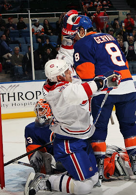 While Halak has struggled at times in his career on the road, tonight had all the feel of a home game. A snowstorm was blamed for poor attendance although the Islanders haven’t exactly been spinning the turnstiles on clear nights. Of the 7000 in the building, broadcasters estimated that Canadiens’ fans outnumbered their hosts two to one.
