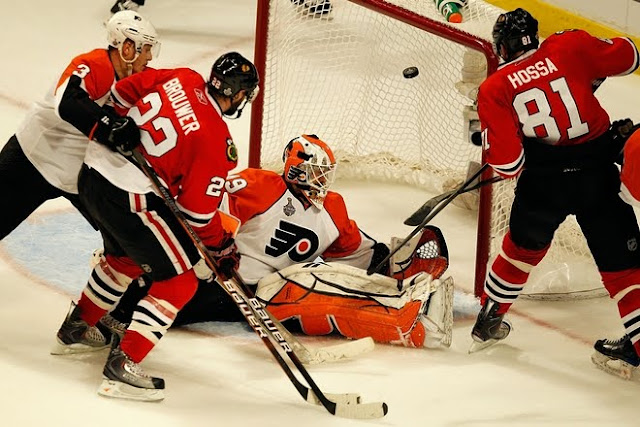 On the second Chicago goal, Leighton was playing deep and was down early with a shot going over his shoulder. Coming just 28 seconds after the first Blackhawks goal, it was a backbreaker for Philadelphia.